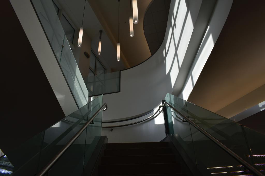 Our factory supply and install all shapes stainless steel staircase skeletons with toughened glass in plain, etched or color designed, beside tempered laminated floor tiles glass, for offices, showrooms or residential villas.